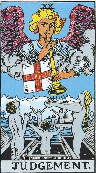 - El Juicio representa la lucidez de juicio, un *renacimiento, el llamado interno, la absolución* y el perdón. Es una toma final de decisiones que se hacen con razón y emoción.