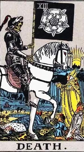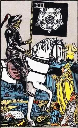 La Muerte es una de las cartas más temidas y malinterpretadas del Tarot. Representa a un esqueleto con una guadaña que cabalga sobre un caballo blanco, segando la vida de todo lo que encuentra a su paso. Su fondo es oscuro y sombrío, y se ven personas, animales y plantas que caen ante su poder.