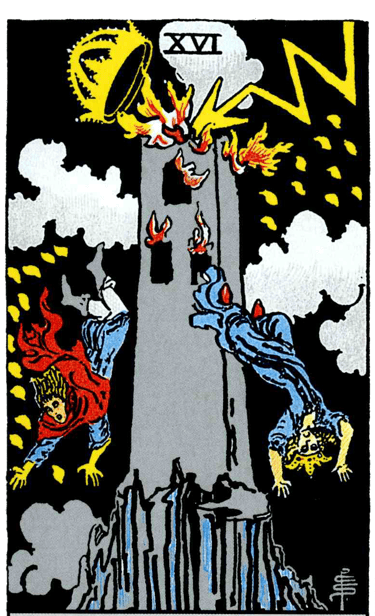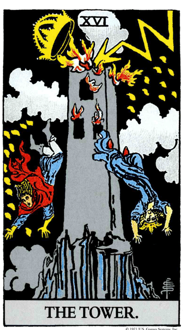 La Torre, el arcano mayor número 16 del Tarot, evoca imágenes de destrucción y cambio abrupto. Su representación gráfica es impactante: una alta torre construida sobre una montaña escarpada, llamas saliendo de sus ventanas y un gigantesco rayo destrozando su cúpula dorada. Personas desesperadas saltan desde la torre, huyendo del caos.